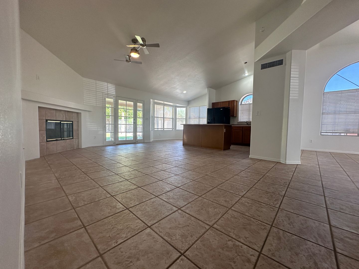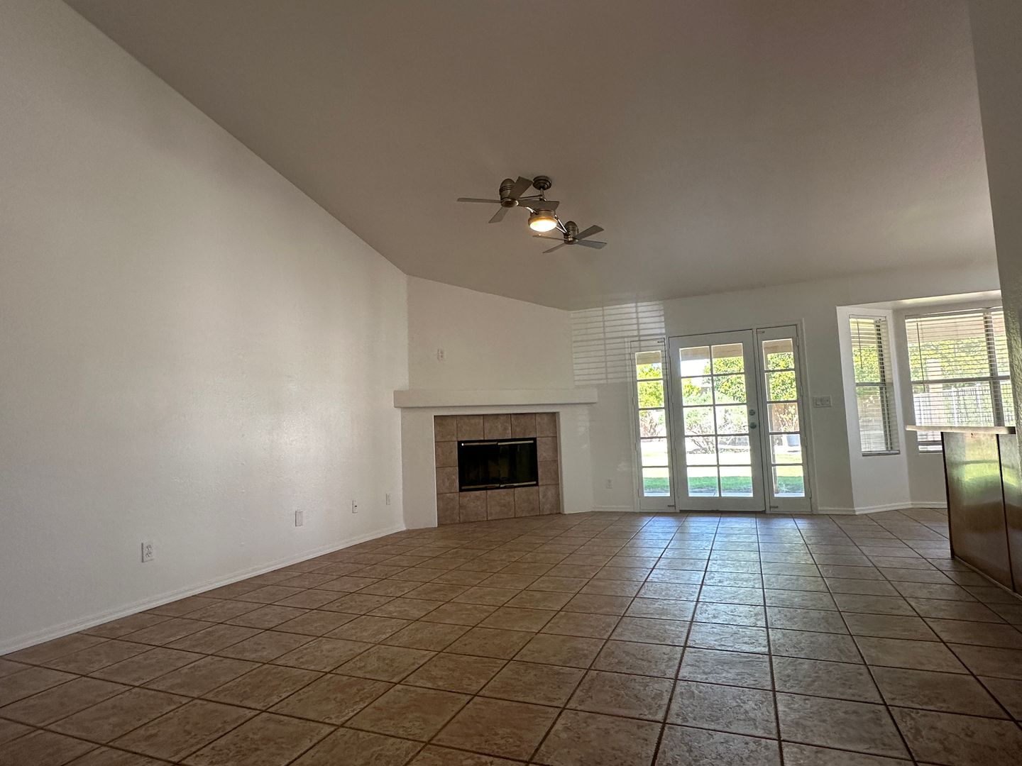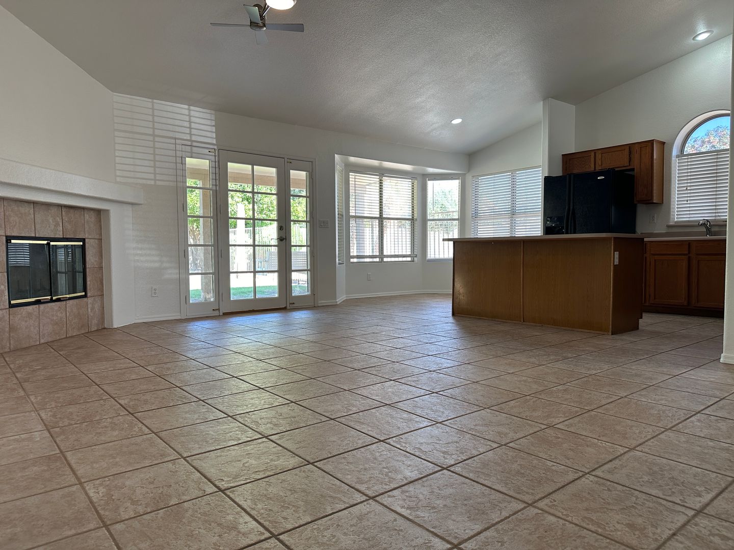 Inside, the home offers both a formal living room and a family room with a wood-burning fireplace. The open kitchen features an island and comes with a refrigerator included.