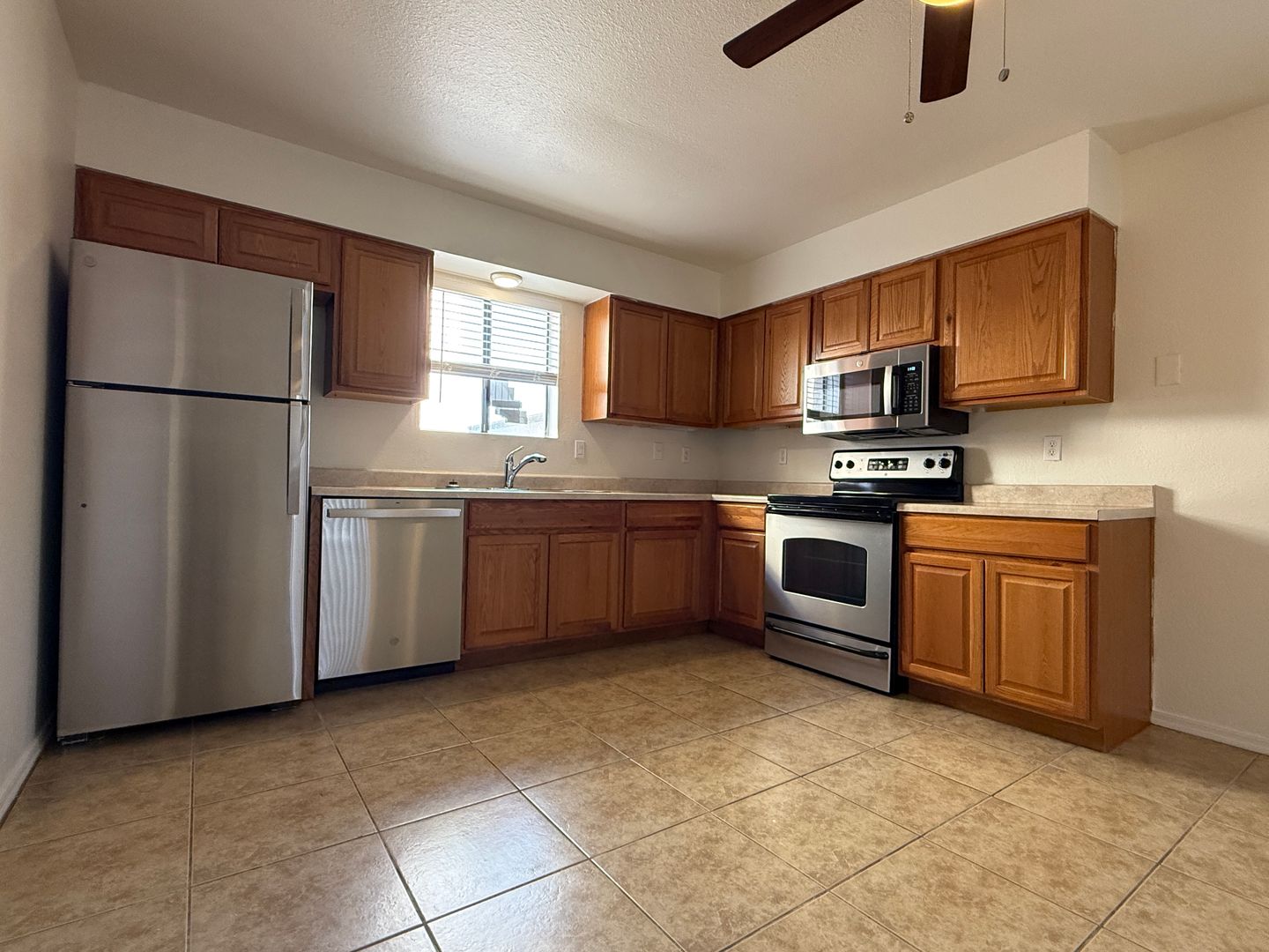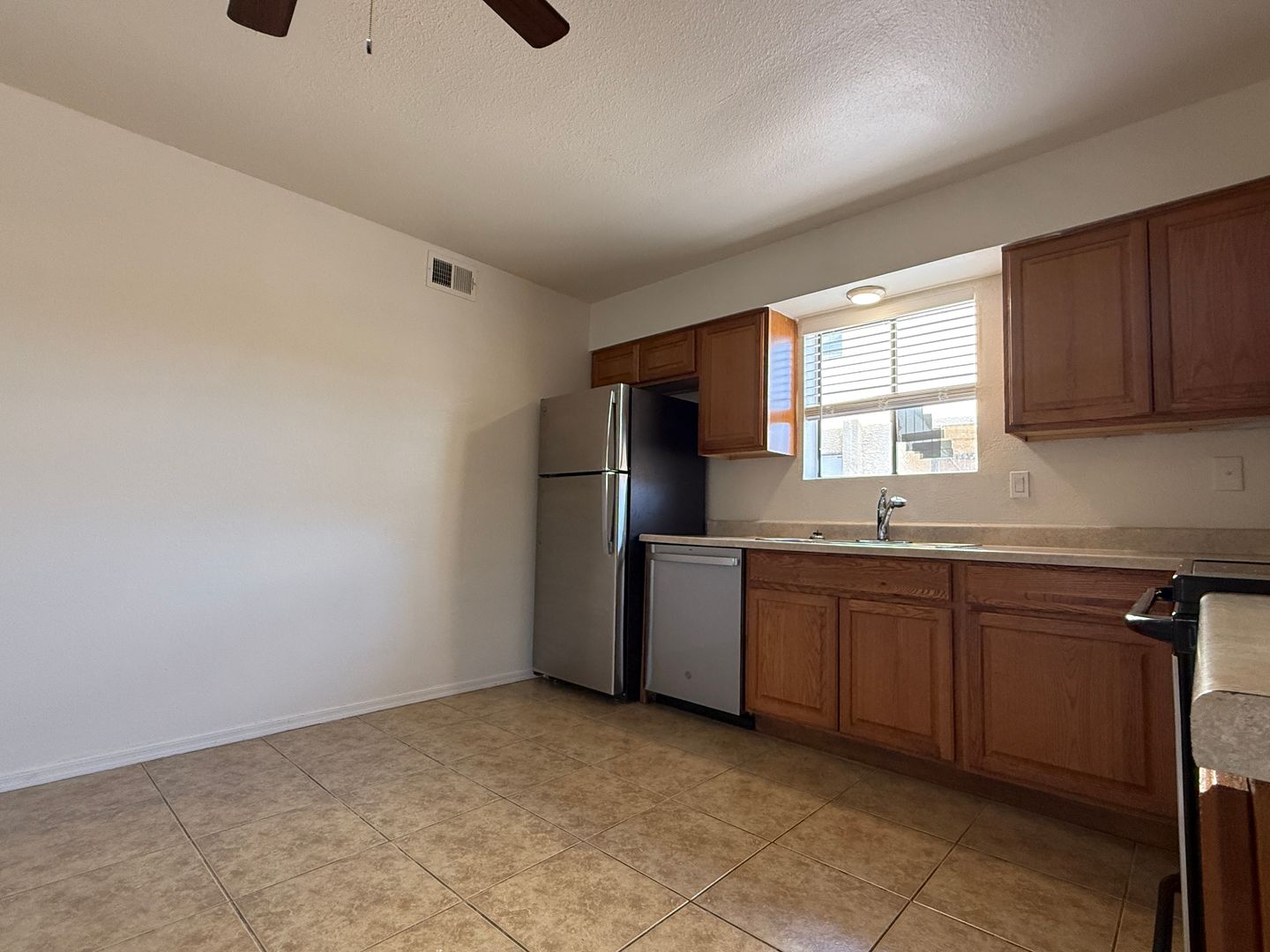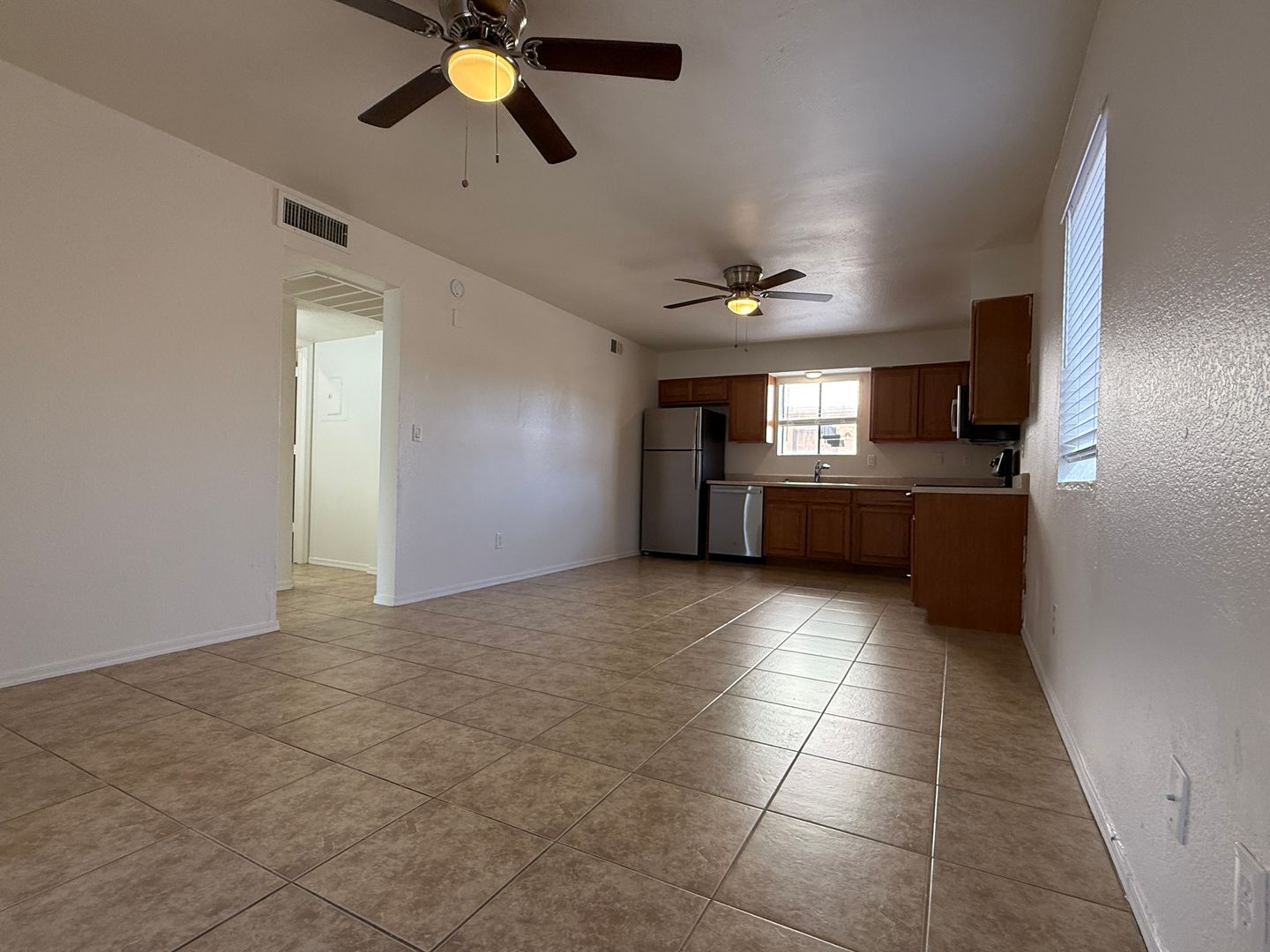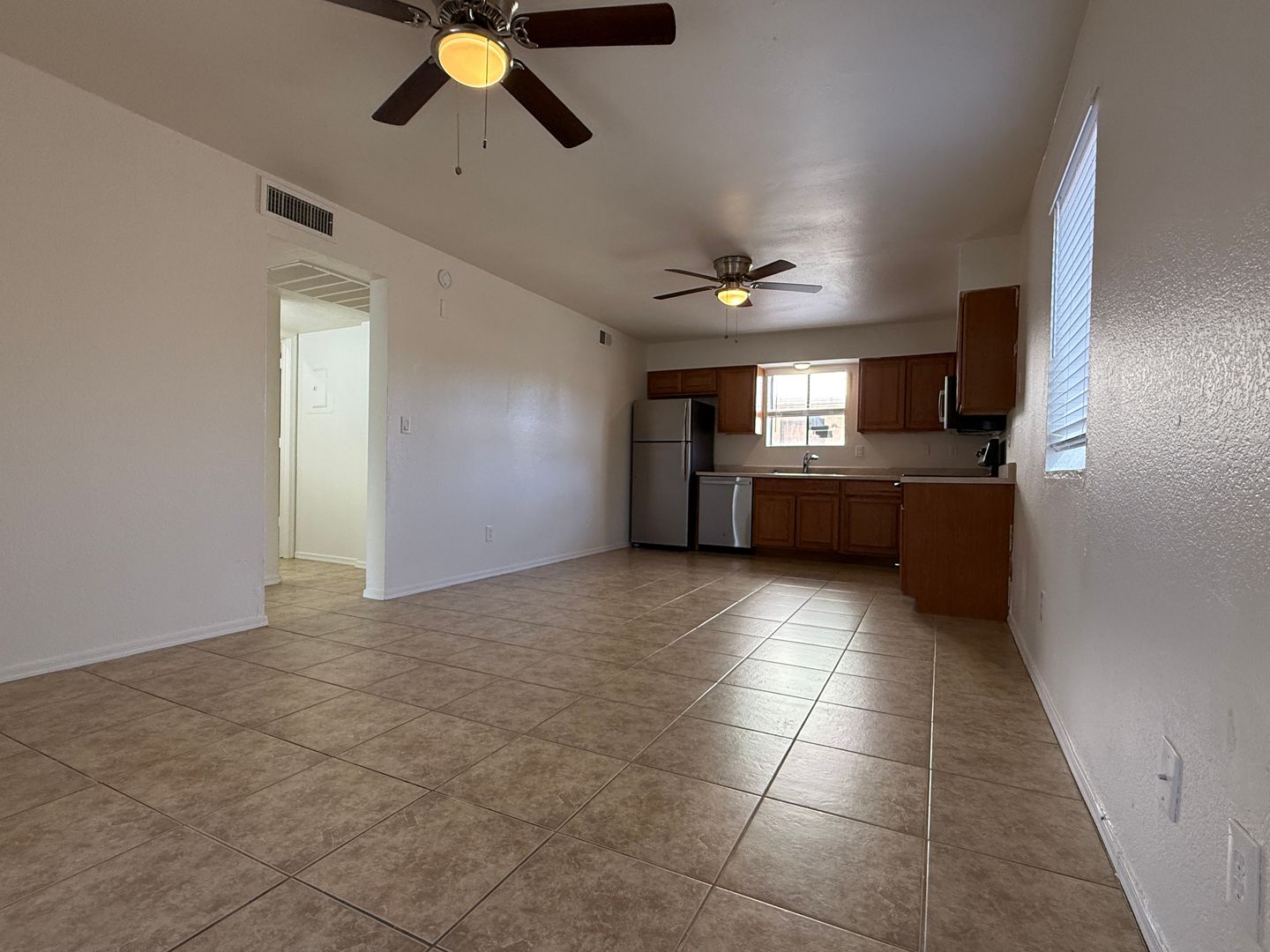 The kitchen includes a refrigerator, and community laundry is available on site. The community amenities include a pool and basketball courts.