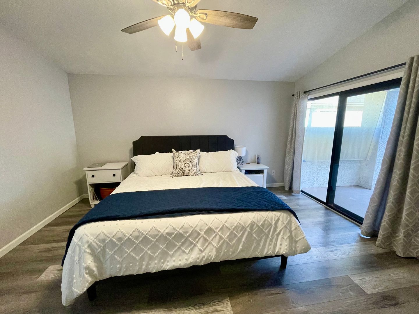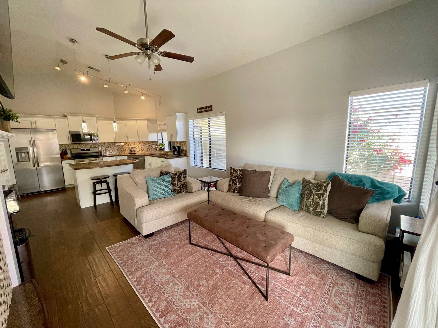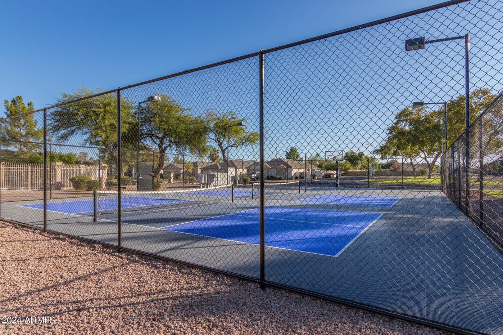 Home Sweet Home! Stunning "RENT READY" 3-bed, 2-bath home in the Sundance Villas community. As you enter, you will be greeted by a bright and spacious open floor plan. The living area boasts woodgrain tile, while the bedrooms have water-resistant luxury plank flooring. The centerpiece of the family room and kitchen is a 2-way wood-burning fireplace that brings charm and warmth. The kitchen is fully equipped with granite countertops, subway tile backsplash, white staggered self-closing cabinets, a breakfast bar, and a large pantry. The low-maintenance backyard and covered patio make it easy to enjoy the outdoors. The primary suite features double doors that lead to a large walk-in closet and side yard access. The master bath includes a large tiled walk-in shower, a skylight, and a double sink vanity with ample cabinet space. Enjoy a maintenance-free community pool just outside your front door alongside a pickleball/half-basketball court.
