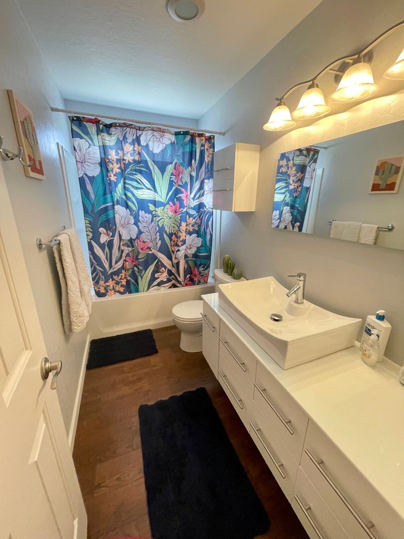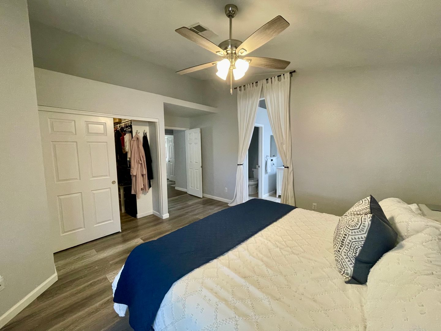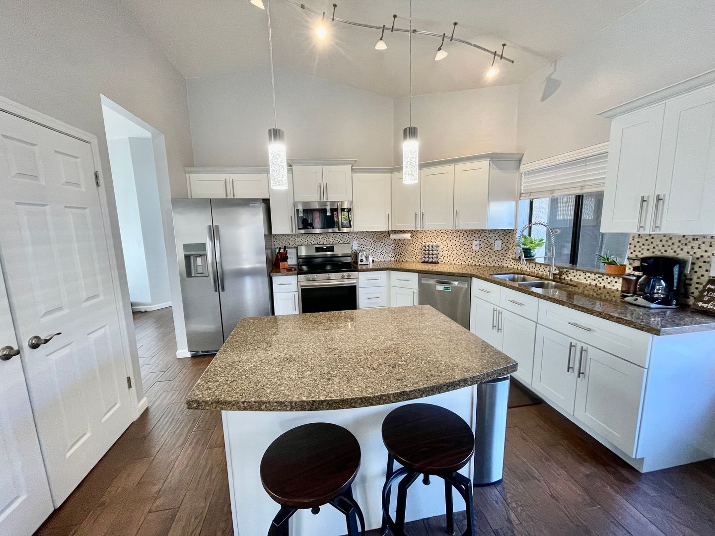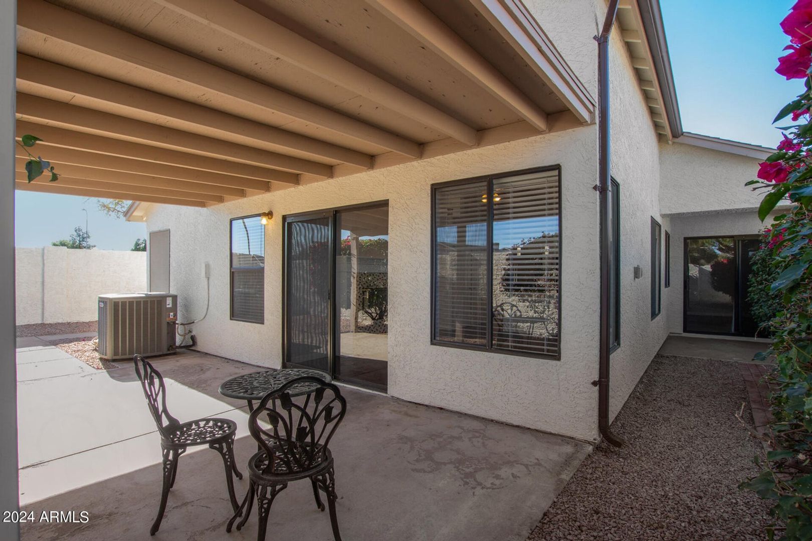 Home Sweet Home! Stunning "RENT READY" 3-bed, 2-bath home in the Sundance Villas community. As you enter, you will be greeted by a bright and spacious open floor plan. The living area boasts woodgrain tile, while the bedrooms have water-resistant luxury plank flooring. The centerpiece of the family room and kitchen is a 2-way wood-burning fireplace that brings charm and warmth. The kitchen is fully equipped with granite countertops, subway tile backsplash, white staggered self-closing cabinets, a breakfast bar, and a large pantry. The low-maintenance backyard and covered patio make it easy to enjoy the outdoors. The primary suite features double doors that lead to a large walk-in closet and side yard access. The master bath includes a large tiled walk-in shower, a skylight, and a double sink vanity with ample cabinet space. Enjoy a maintenance-free community pool just outside your front door alongside a pickleball/half-basketball court.